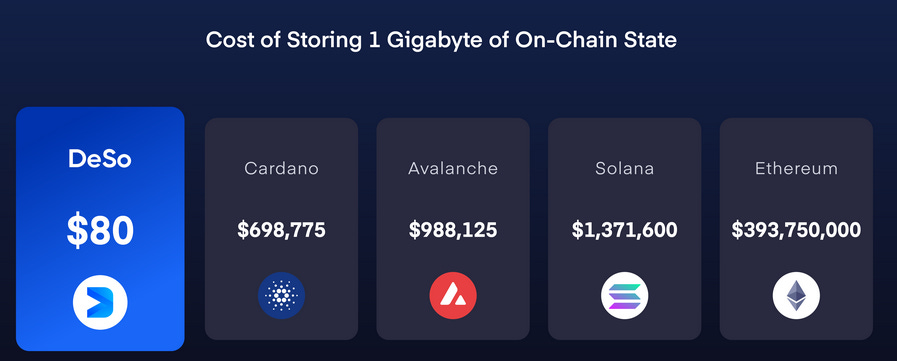Unlike Lens, DeSo (formally known as BitClout) launched 2019 in the post-ICO era before NFTs were a thing. DeSo was built from the ground up to be a storage-heavy “infinite state” blockchain, in contrast to the general-purpose L1s of today that are designed to be “finite state” and store only account balances. This design lets DeSo store all raw data on-chain inexpensively, to be indexed and queried quickly like Google’s search engine.