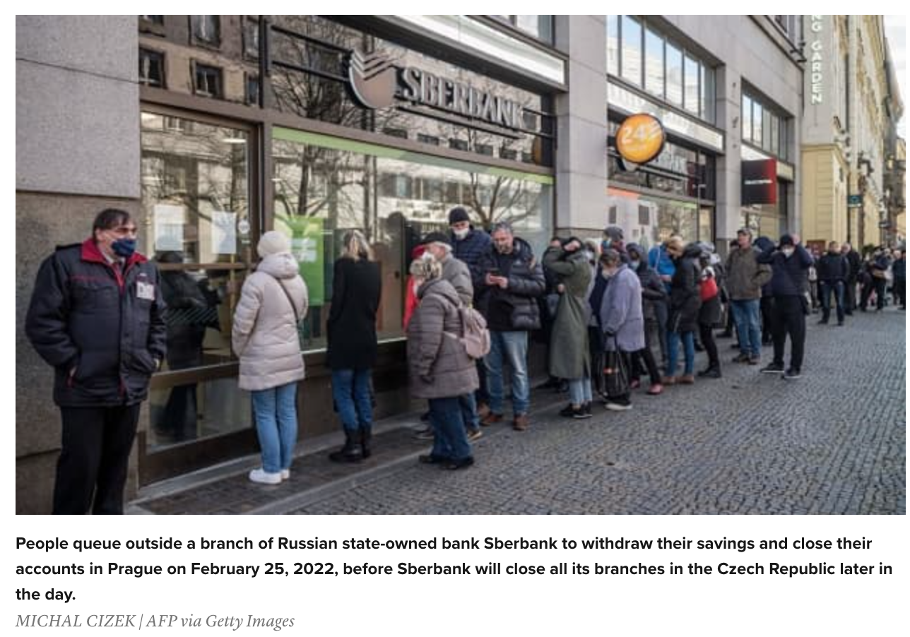 Russian citizens both inside and outside of Russia have been waiting in hour-long queues to withdraw their cash from Russian bank accounts.