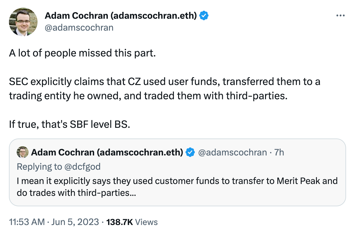 Concerningly, the SEC indicates that as of the publication of their complaint, not all crypto assets stored on Binance.US are “within [its] exclusive custody and control,” indicating that Binance International maintains custodianship over some portion of the exchange’s funds.