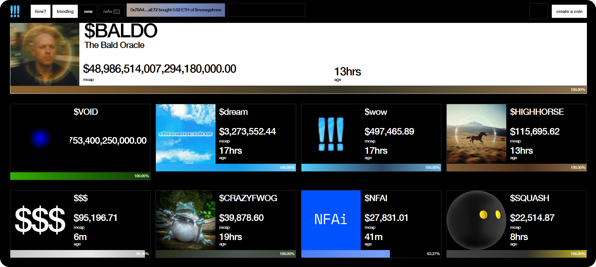 - The first tokens: A handful of the initial wave of memecoins on Wow have already graduated to Uniswap, including $DREAM, $WOW, $HIGHHORSE, $BALDO, and $CRAZYFWOG. The combined market cap of these 5 tokens is just over $3 million right now, so these are certainly still "micro-caps," but they offer a taste of what's likely coming here: a surge of ERC-20z memecoins on Base.