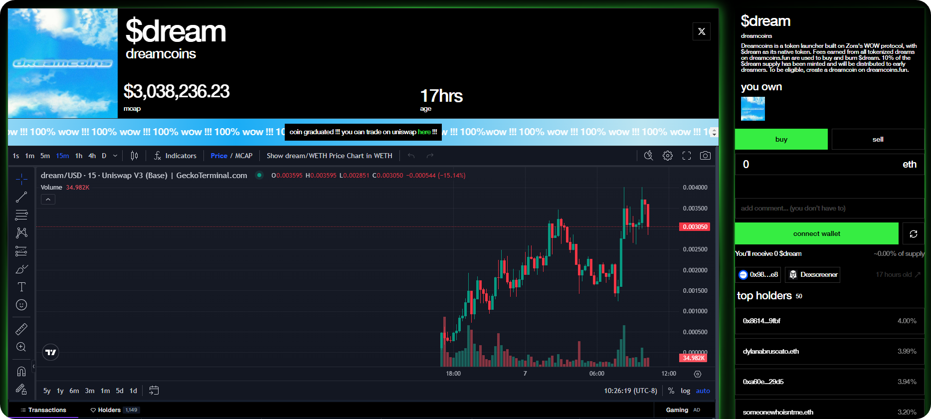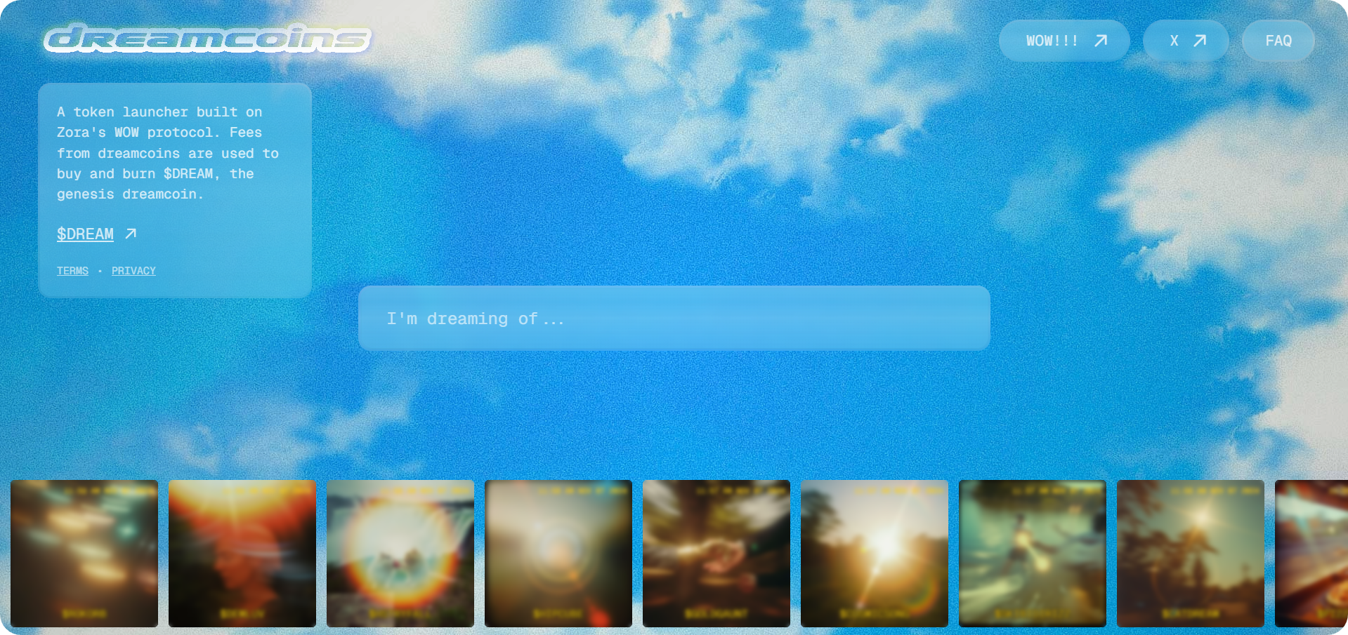 - Composability potential: Keep in mind that Wow is an open protocol, and we've already started to see other projects building on top of it. One such project is dreamcoins, an AI-powered token launcher that turns text prompts into quick memecoin deployments. Notably, the platform uses its 0.5% creator fee earnings for $DREAM buy-and-burns, suggesting more community tokenomics experiments are on the way here.