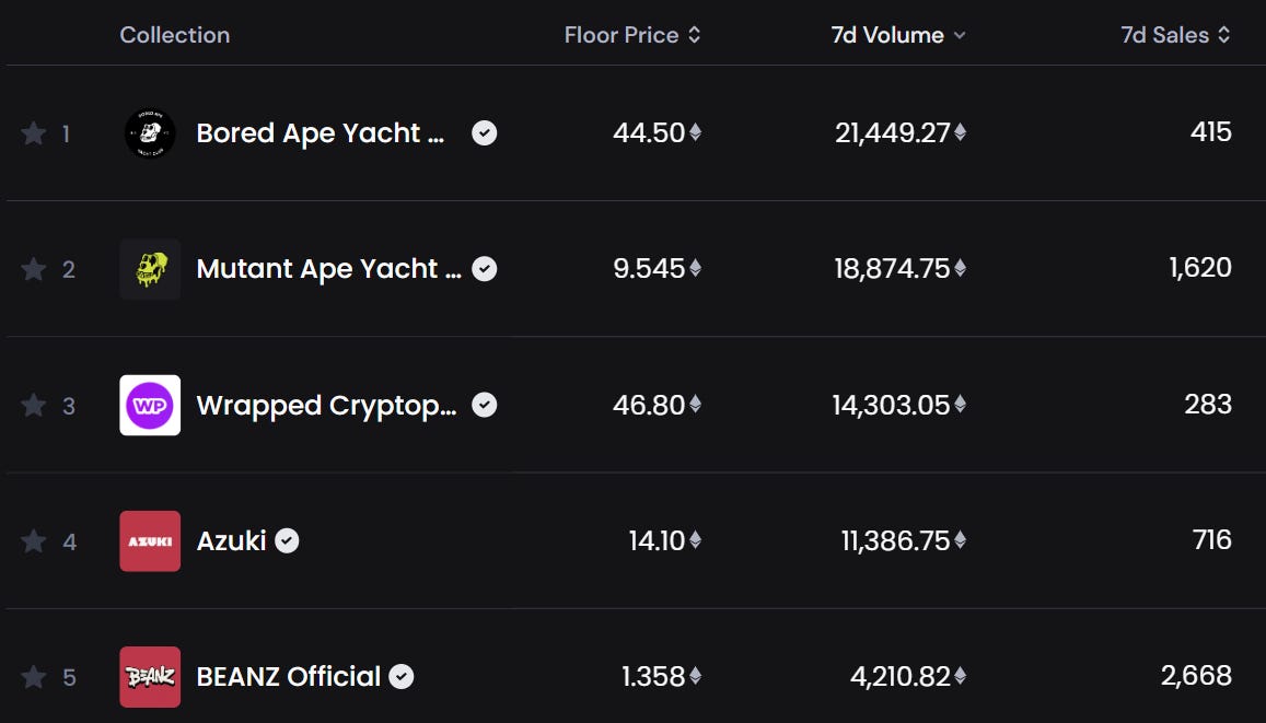 7D volume stats were way down this week for all major NFT collections. After Wrapped CryptoPunks topped these charts for the past month in a row, BAYC edged into the pole position once more this week upon a major wave of sell pressure that saw the floor price of Bored Apes hit sub-50 ETH for the first time in a long time. Outside of Yuga Labs collections, the other collections in the top 5 this week were Chiru Labs projects Azuki and BEANZ.