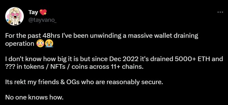This week, Taylor Monahan wrote a thread on a mysterious “massive wallet draining operation” that had already claimed a trove of ETH and NFTs across some dozen or so chains. It appears to be a seed phrase leak of some sort, but no one’s quite sure how or where from yet. Needless to say, it’s a great time to revisit your approach to securing your crypto and NFTs. My recommendation? Use a layered approach: start with hardware wallets as your base, consolidate with aSafe vault, and then use safety tools like delegate.cash, revoke.cash, and Stelo for added protection.