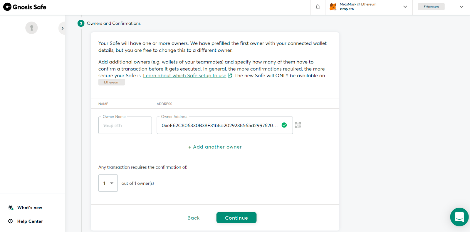 - On the next screen you’ll add your other desired signing addresses and configure how many owners have to confirm transactions, e.g. 2 out of 3 owners