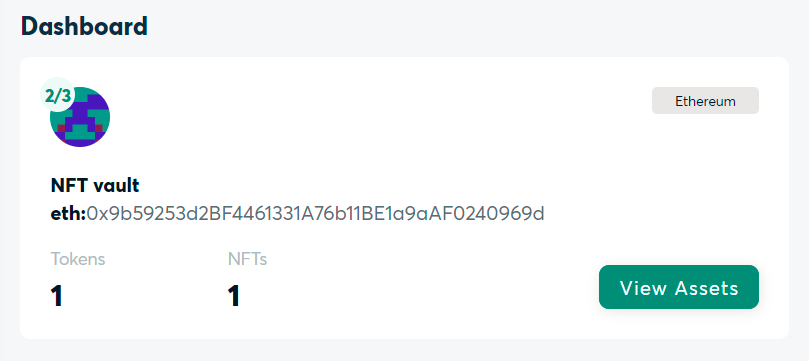 Back in the main Gnosis Safe dashboard, you’ll be able to see your new NFT vault and its address.