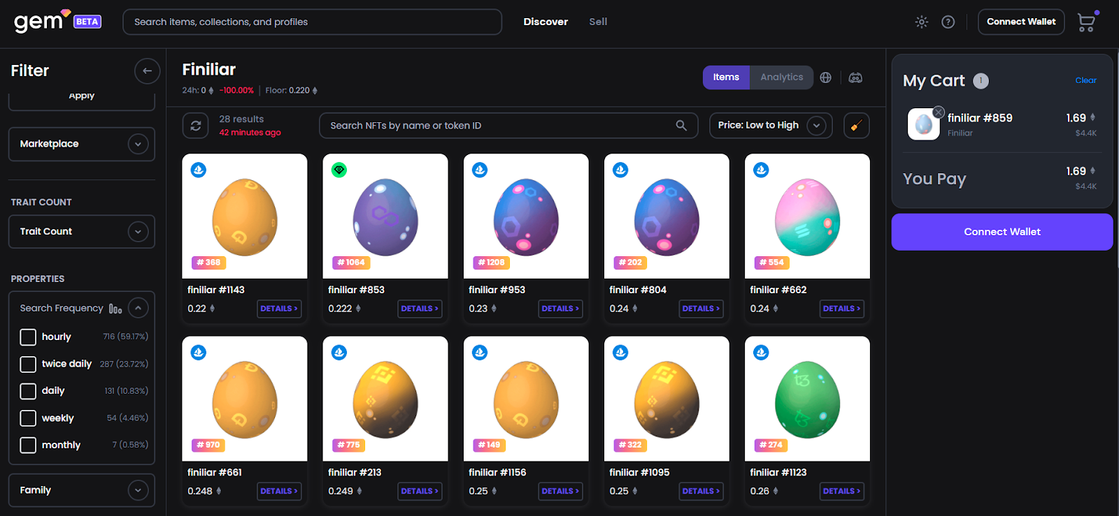 At the time of this post’s writing the Finiliar collection’s floor price was 0.22 ETH and its market was very thin, with only ~30 eggs listed for sale across OpenSea and LooksRare.