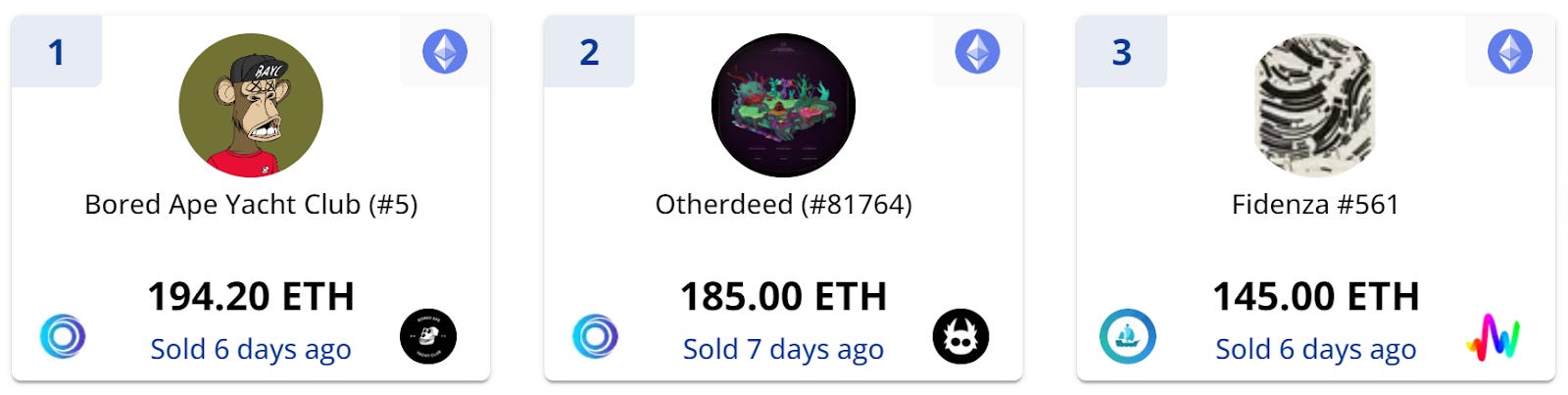 There were more major Yuga Labs transactions this week. One was a BAYC sale and the other was an Otherdeed sale, and both purchases were for over the equivalent of ~$240k USD in ETH. This week we also saw a Fidenza, the crown jewel of the Art Blocks ecosystem, crack the top 3 with a Ξ145 resale.