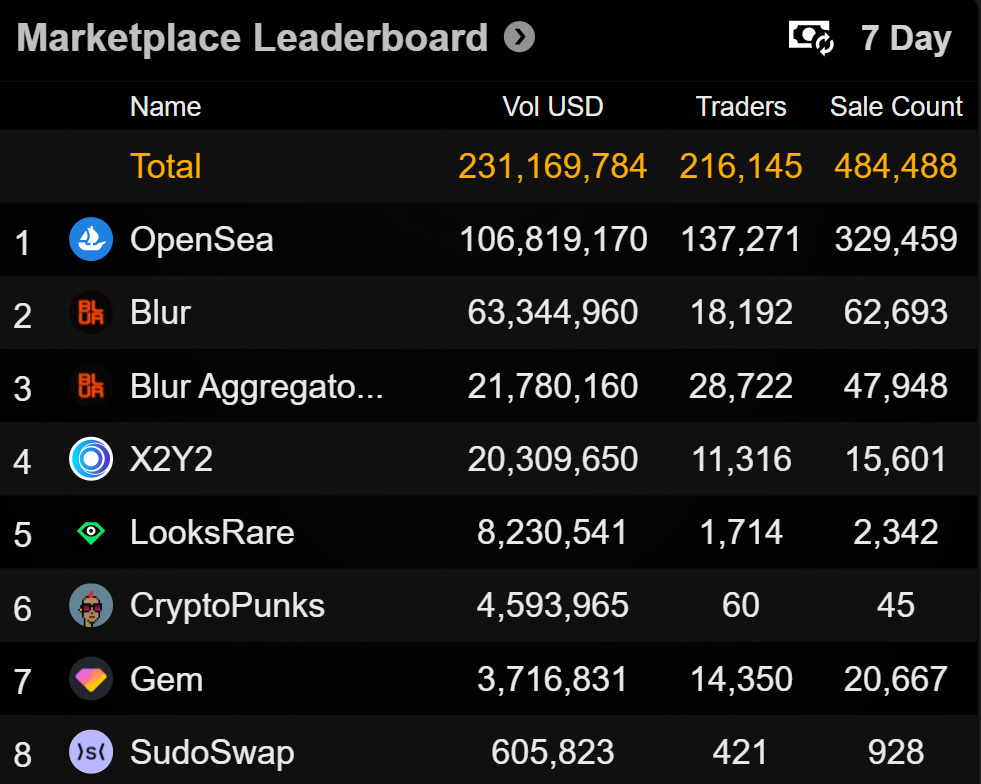 This week we saw OpenSea OpenSea break out with a decisive volume lead over Blur Blur once more. Stats-wise, X2Y2 is firmly in 3rd place right now with LooksRare a distant 4th.