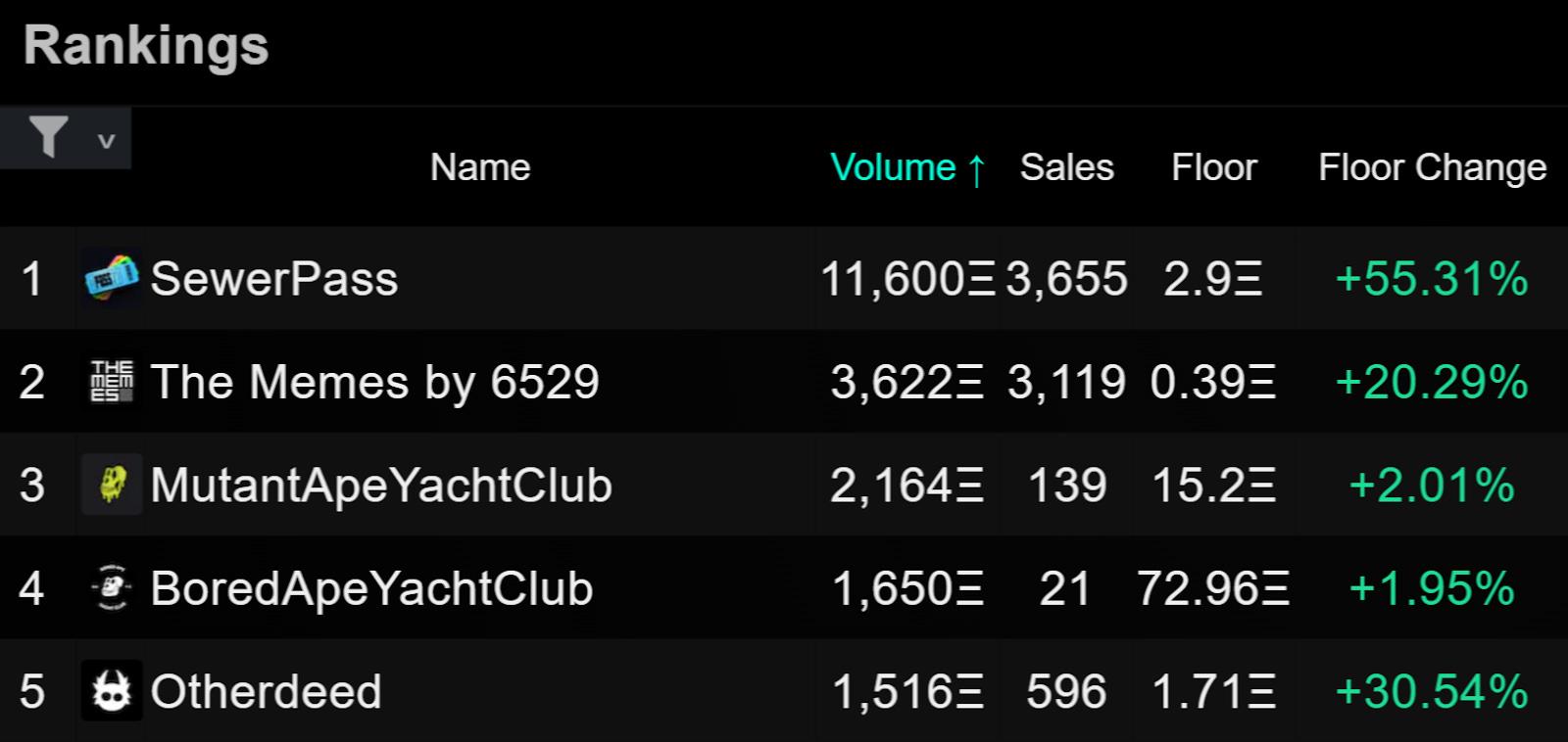 Unsurprisingly, the Sewer Pass access NFTs dominated weekly volume stats as all eyes remain on Yuga Labs’s Dookey Dash skill-based mint competition. We also saw a really strong volume showing around The Memes Collection by 6529, which has become an iconic series to watch in 2023.