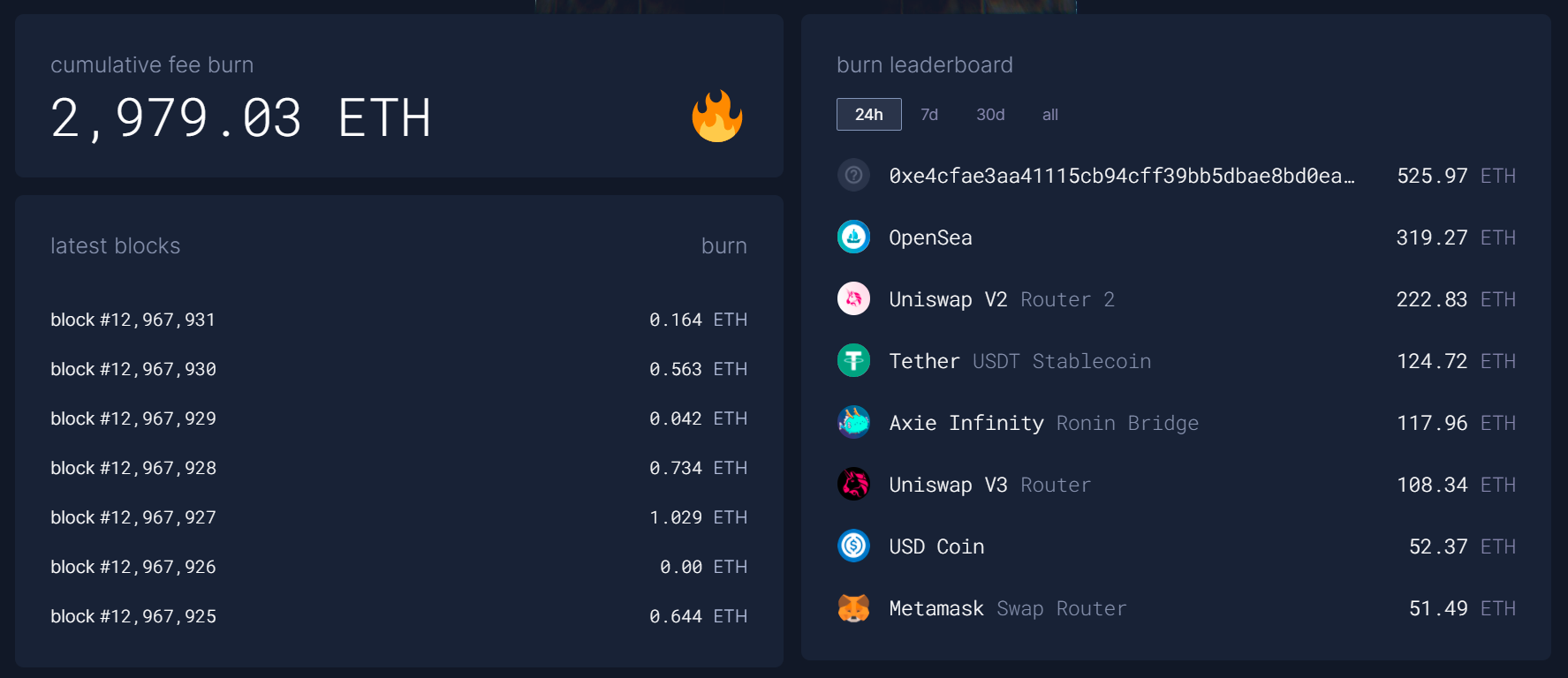 That’s impressive in and of itself, but it’s also interesting to zoom in and see which projects have been the biggest ETH burners this early on. As you can see in the picture above, two of the top 5 ETH infernos so far have been leading NFT marketplace OpenSea (+300 ETH burned) and leading NFT game Axie Infinity (+100 ETH burned).