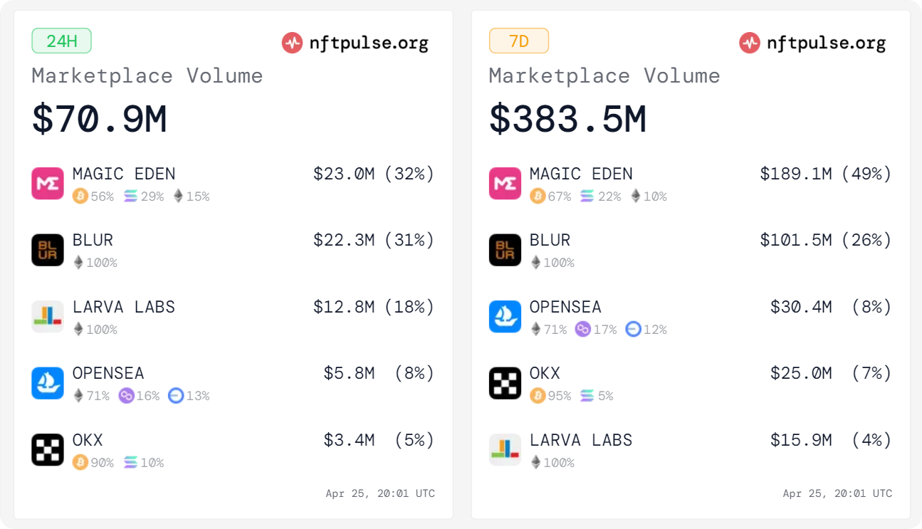 Why it matters: According to NFT Pulse, Magic Eden had the most users, revenue, volume, and royalties paid out of any NFT marketplace over the past week. The Base Base integration allows the platform, which already supports Bitcoin, Ethereum, Polygon, and Solana, to tap into the hottest rising L2 NFT scene, potentially entrenching its dominance that much further.