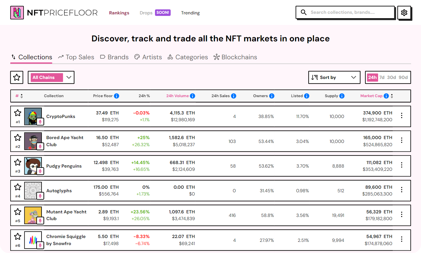 It's particularly great for tracking historical prices, like determining what the floor value of a Pudgy Penguin was on January 1st, 2022, but it also sorts stats across brands (e.g. Yuga Labs), artists, blockchains, and more.