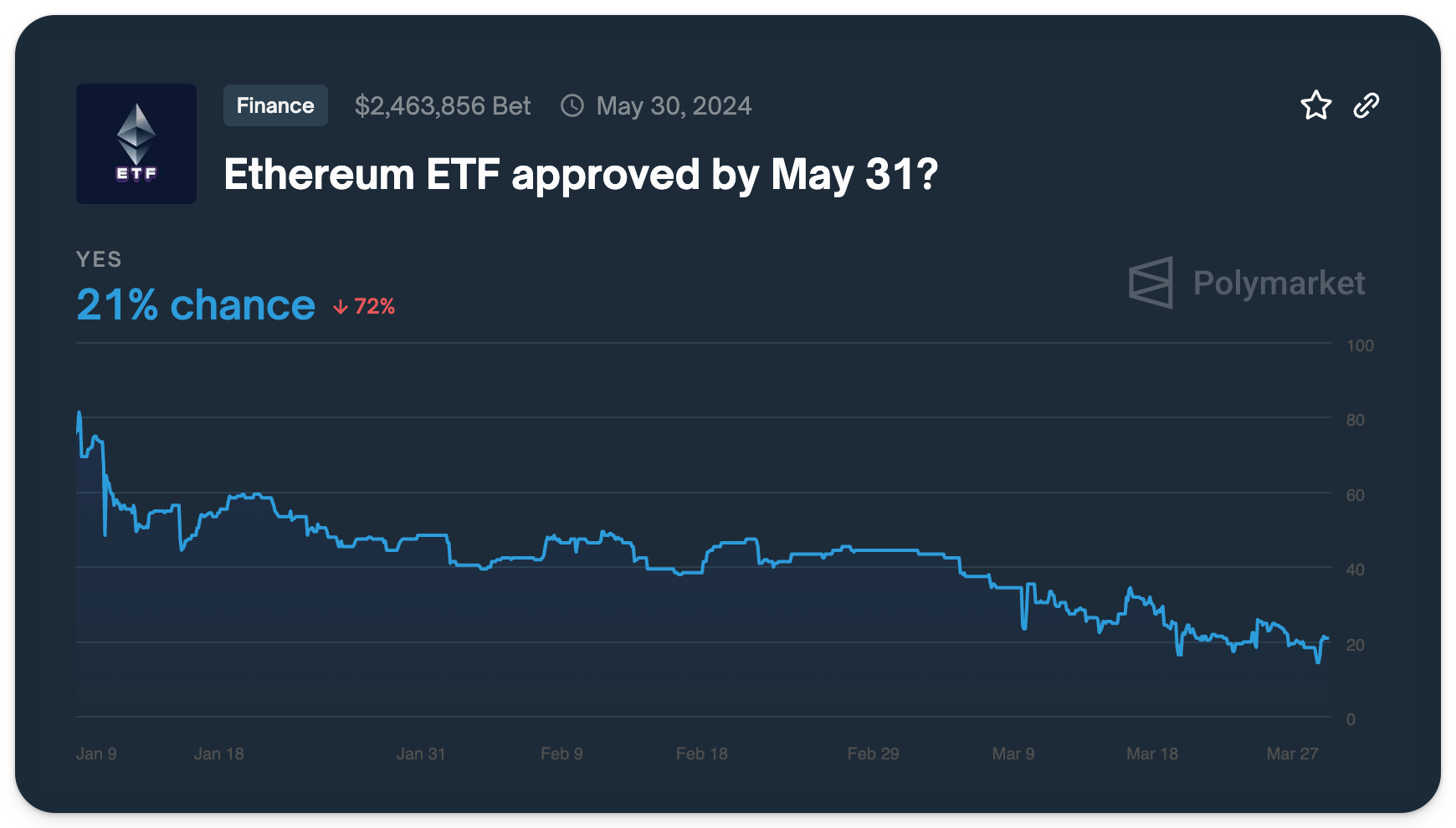 More updates for ETH ETFs this week, with new filings from Bitwise and Fidelity (a $4.5T asset manager) and comments by Blackrock CEO Larry Fink, who said the ETF is still possible even if ETH is a security. Both ETFs also included staking, following the trend of ETFs being updated to include this feature. Currently, Polymarket's prediction market gives the approval of these ETFs by May 31st only a 21% chance, indicating that approval would indeed be an unexpected development.