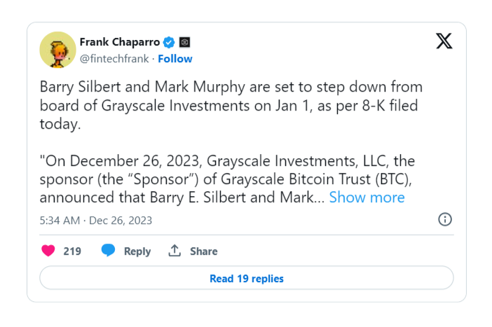 Replacing Silbert as Grayscale’s chair is Mark Shifke, the current CFO of DCG, who was joined in his appointment to the board by Matt Kummell, a senior vice president of operations at DCG, and Edward McGee, Grayscale’s CFO. Michael Sonnenshein, the CEO of Grayscale, will retain his position on the board.