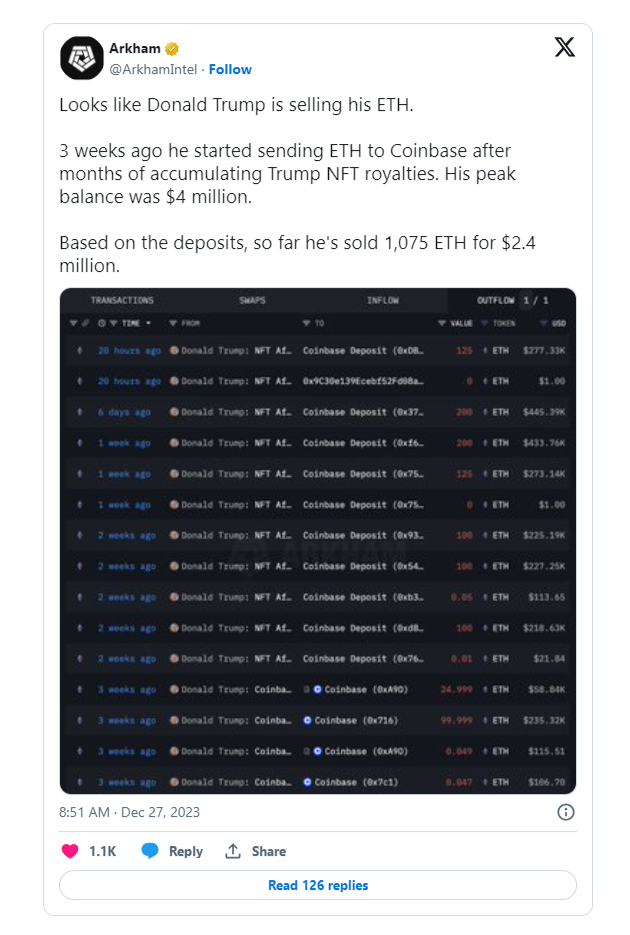 Former US President Donald Trump appears to have dumped his ETH after the wallet that received royalty payments from his NFT trading card collection sent 1.1k ETH ($2.4M) to Coinbase deposit addresses over the past three weeks.