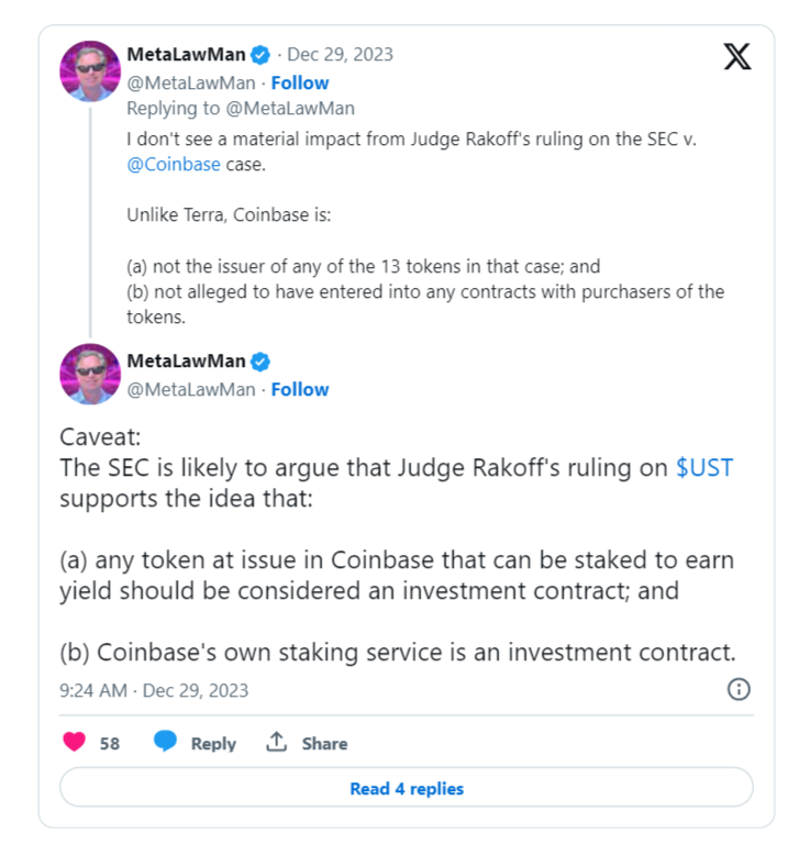 Zooming in, MIR and UST were found to be sold as investment contracts because they were yield-bearing instruments, a point that will likely be seized upon by the SEC in its attempt to argue that staking services offered to US citizens by exchanges like