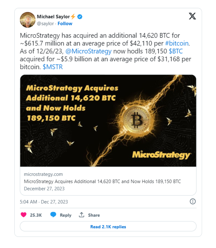 MicroStrategy (MSTR) founder and chair Michael Saylor announced Wednesday that his company had acquired an additional 14.6k BTC for $616M at an average cost of $42.1k per token.