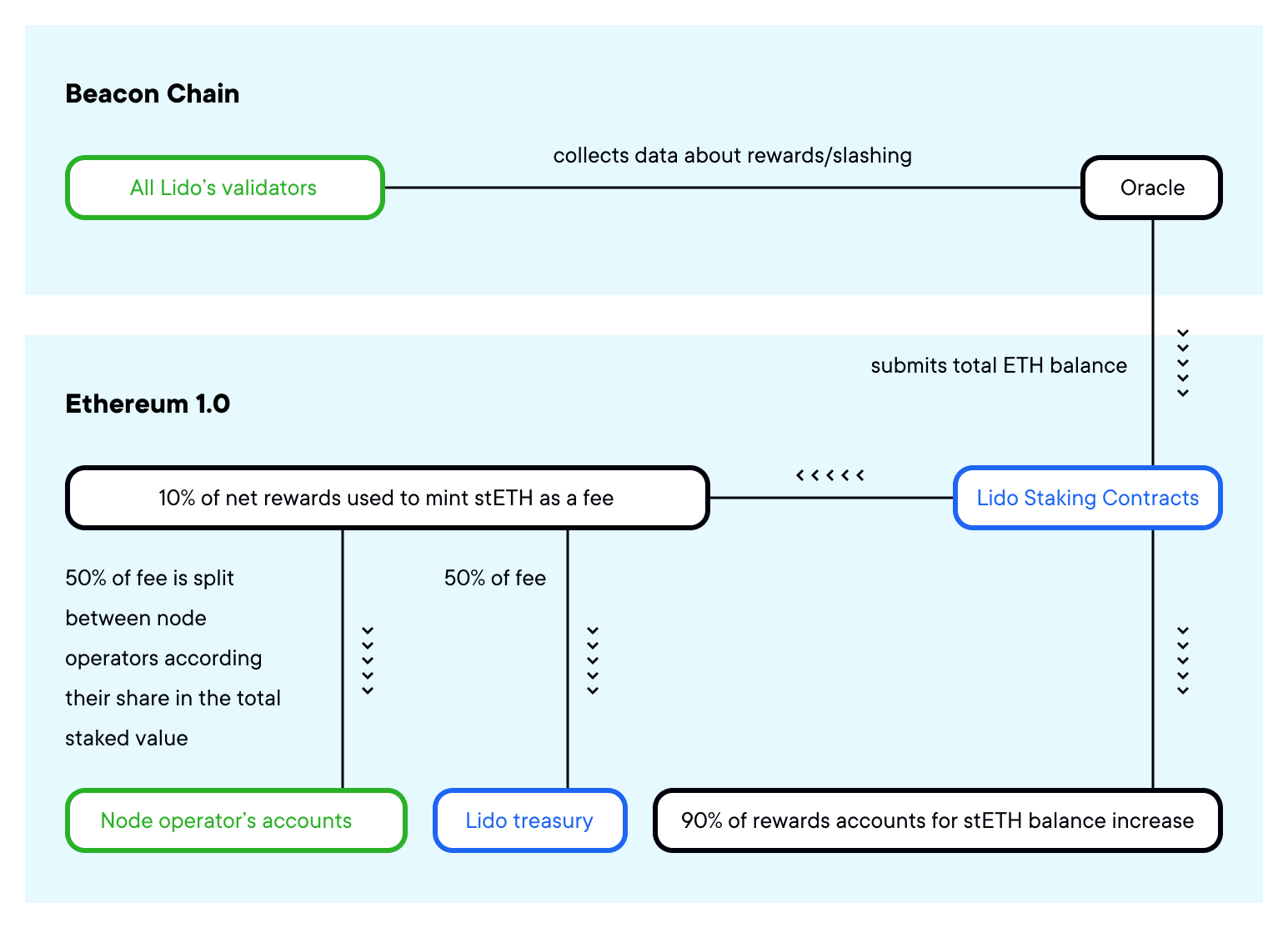 The protocol uses oracles selected by the DAO to monitor validators’ balances and to rebase users' stETH balances to account for rewards.