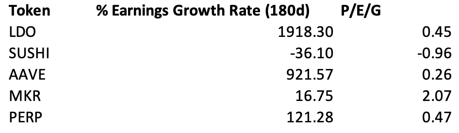 However, looking at Lido’s price/earnings relative to its growth tells a different story. Due to its incredibly high growth rate of 1918%, LDO’s PEG is just 0.45, putting it in-line with that of PERP and AAVE.