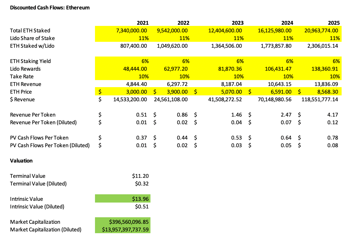 Using these parameters, we can calculate that LDO has an intrinsic value of $13.96, which would value it at a circulating market cap of $396 million, and FDV of 13.9 billion.