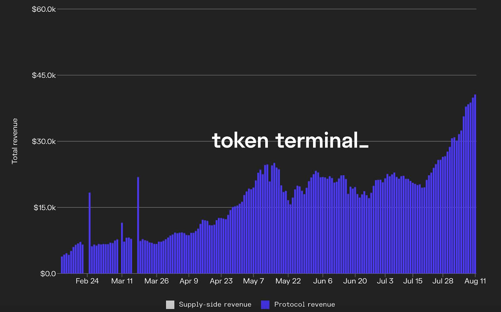 Taking a closer look, we can see that Lido’s daily revenues have reached an all-time high, now exceeding more than $40,000. Interestingly, we can also see that Lido did not experience as severe a decline in revenues compared to some other projects during crypto’s recent market sell-off. For example, while protocols such as
