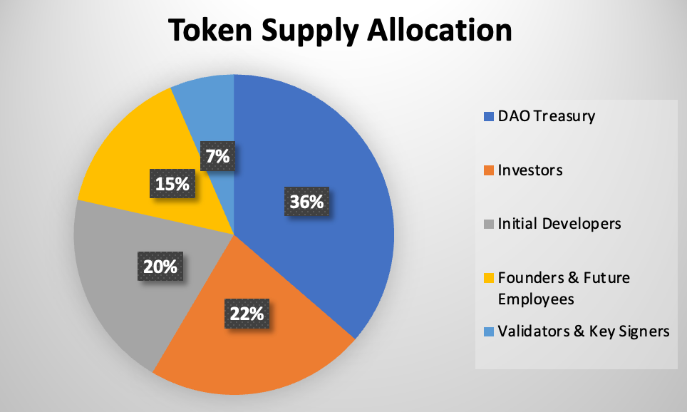 Lido has a total supply of 1 billion tokens. At launch, 36% was allocated to the DAO treasury, a combined 35% to team members (This includes founders, initial protocol developers, and future employees), 22% to investors, and 6.5% to staking validators and the withdrawal key signers.