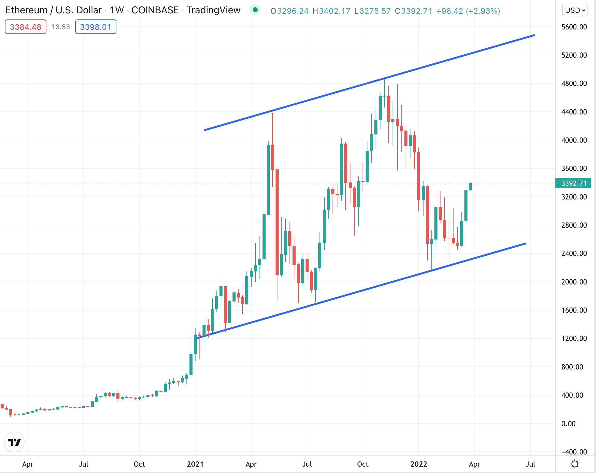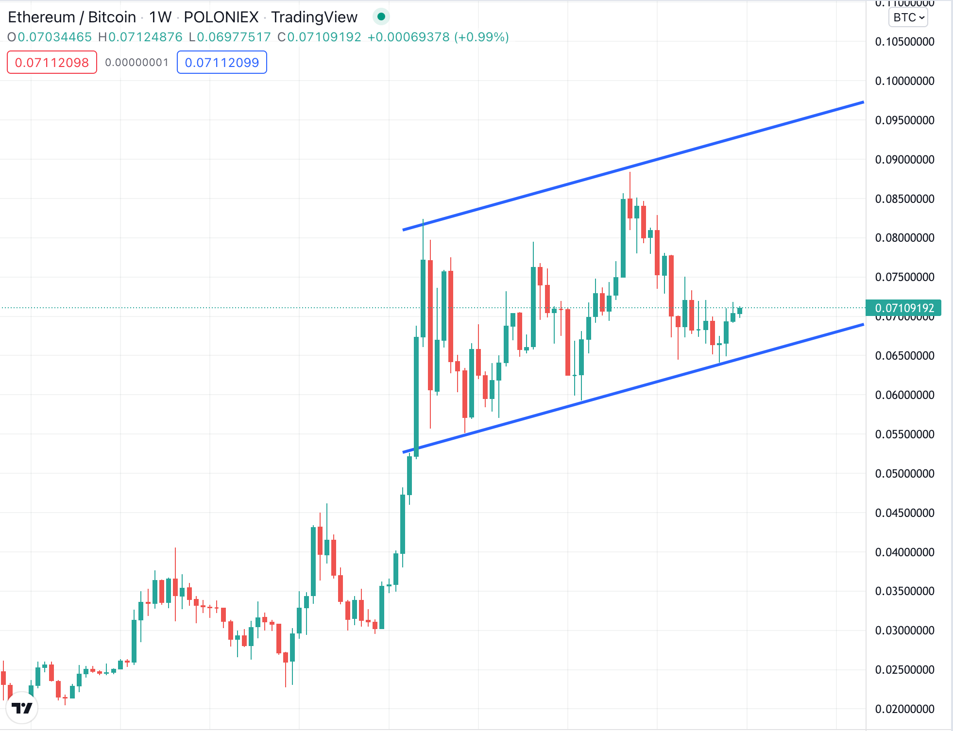 If ETH/BTC followed this channel, a 0.095 ratio would produce an ETH price of ~$4,500 at current BTC prices, and $7,125 if BTC reached the aforementioned $75,000 level.