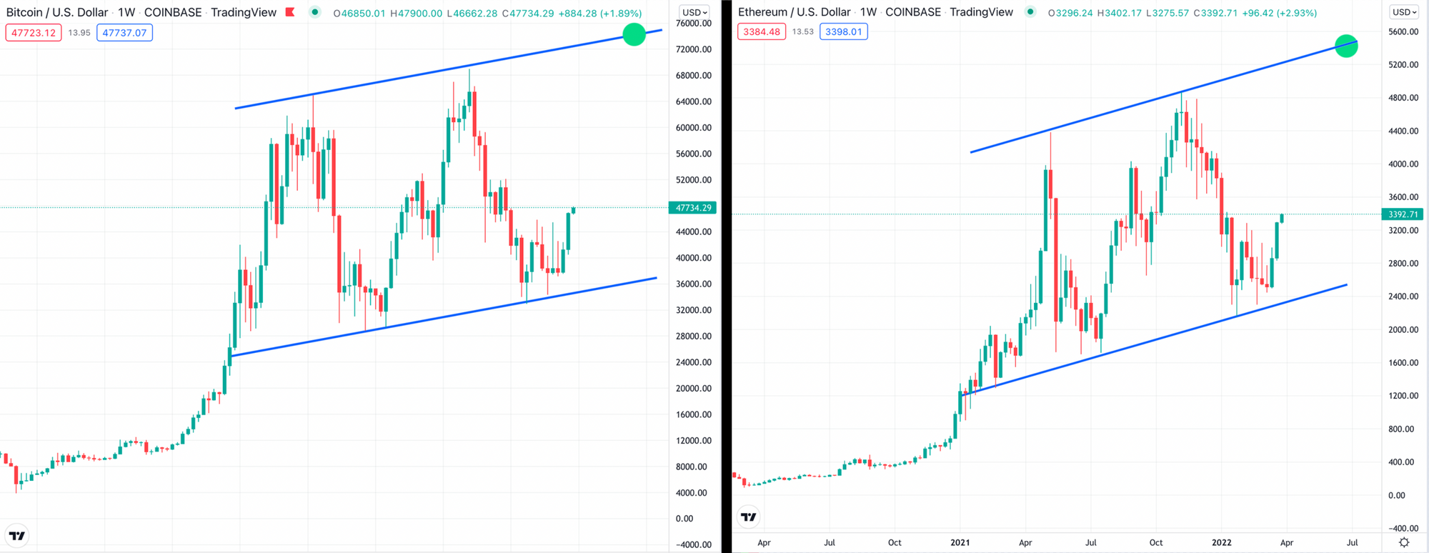 It’s probably not going to play out this simply… but if both BTC and ETH returned to the top of the channels, that would mean a ~$75,000 BTC and ~$5,500 ETH price, by sometime in July.