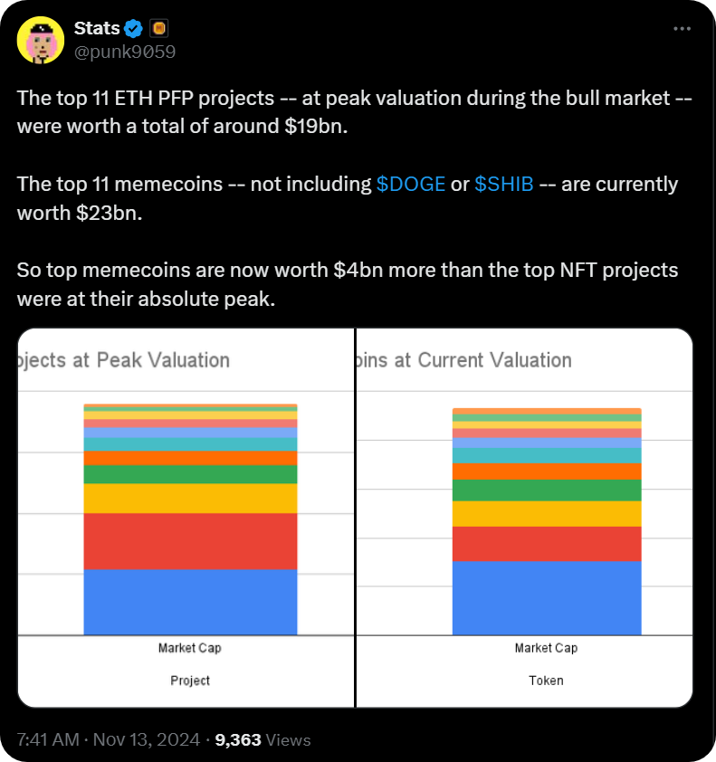 To be sure, the future of NFTs has never been brighter, as their use cases are branching out in all directions, and low-cost mints are very accessible. My main point here is that the cryptoeconomy's culture vertical now has two major asset classes, NFTs and memecoins, while in 2021 it just had one.