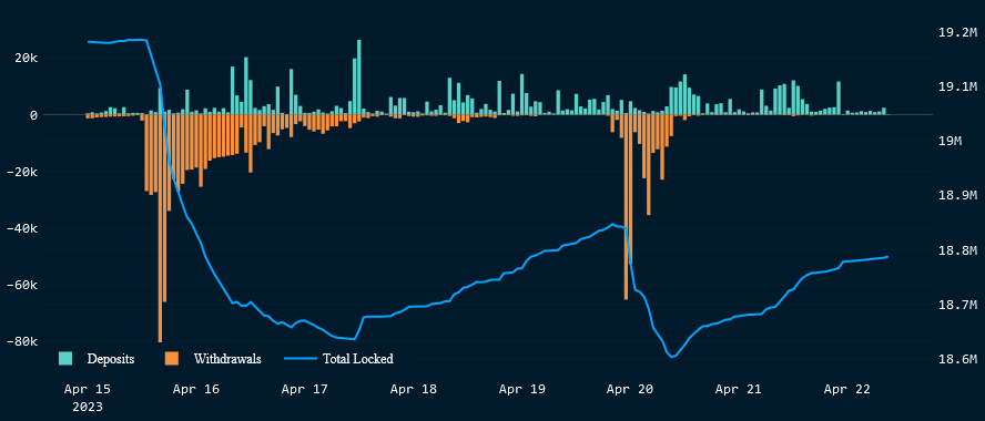 Despite massive withdrawals, ETH deposits are continuing at a steady rate. In the last 24 hours, ETH deposited was a net 74K.