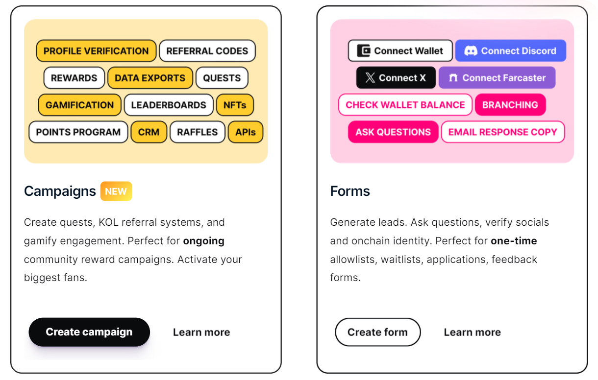 The platform started out as a streamlined form builder for the onchain ecosystem. Its support for wallet connections, Discord, Twitter, and Farcaster have made it a great place for managing and validating info, from allowlists to waitlists.