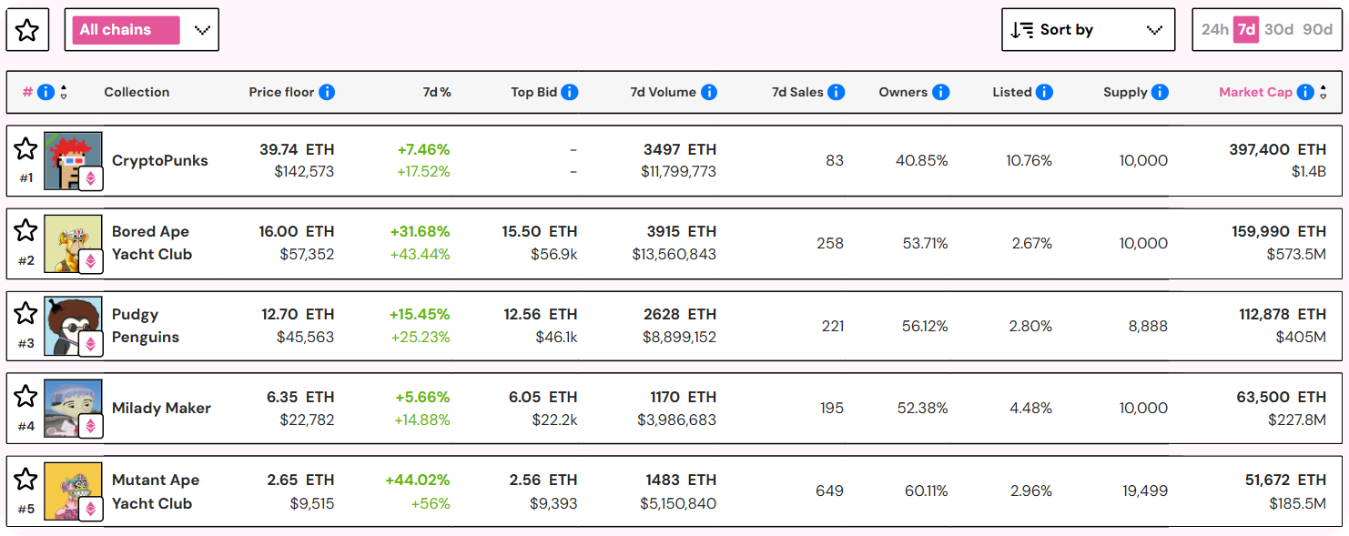 For instance, consider the weekly floor price performances of the top 5 NFT collections by market cap: