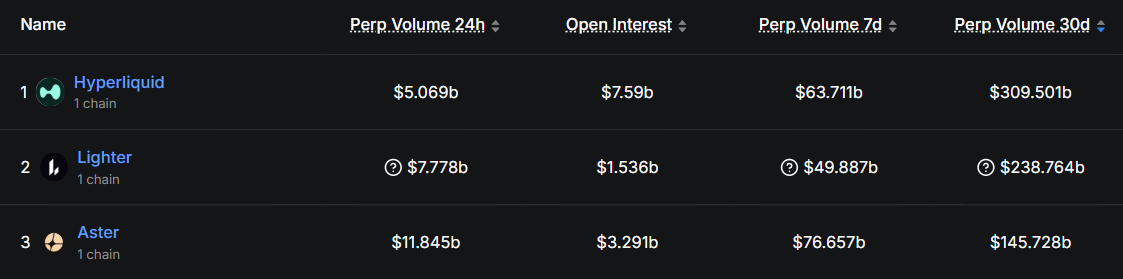 Pero es otro proyecto de Ethereum, una cadena de capa 2, el que está haciendo el mayor volumen de 30D perps en este momento, además de Hyperliquid. Y ese proyecto es Lighter.