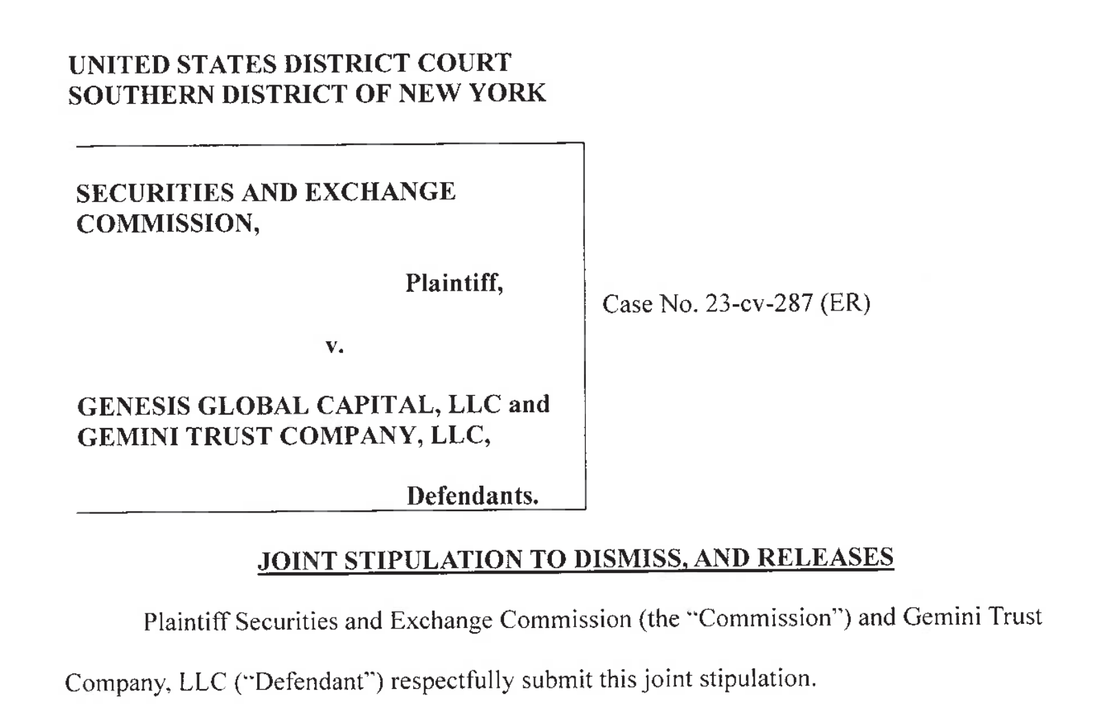 La Comisión de Bolsa y Valores (SEC) ha presentado una solicitud conjunta con Gemini Trust Company, LLC, en la que solicita al Tribunal de Distrito de los Estados Unidos para el Distrito Sur de Nueva York que desestime la acción civil que la Comisión ha emprendido contra la plataforma de intercambio de criptomonedas a cambio de una multa de 21 millones de dólares.
