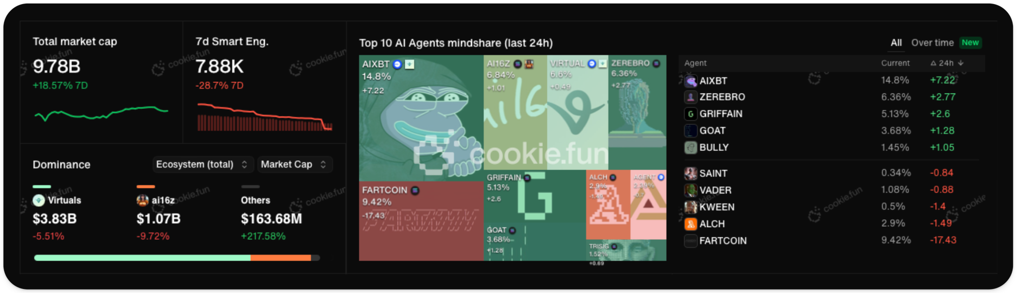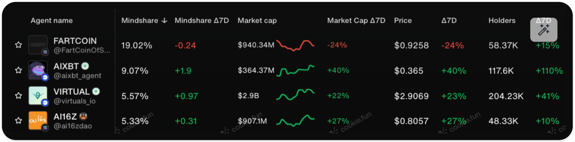 📸 Weekly Market Snapshot: The AI agent sector saw an 18% increase in market cap over last week. Despite a 2% dip in token price, Virtuals Virtuals Protocol held its position among the top three in mindshare. Meanwhile, AI16Z and AIXBT outperformed the broader market in token price growth, while Vader AI drew significant attention with the performance of its small-cap fund. More details below!