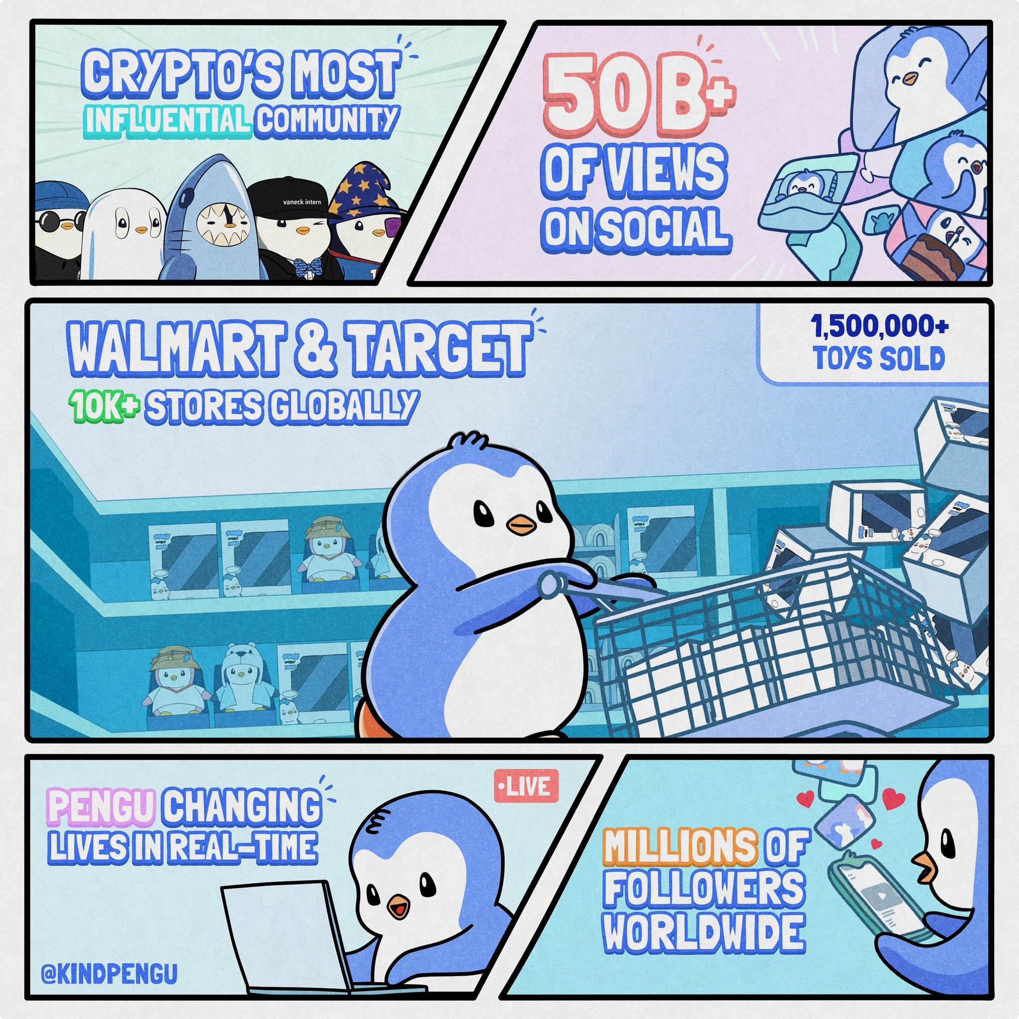 With this accessibility, the Pudgy Penguins Pudgy Penguins are aiming to bring new community members in from mainstream circles, where the iconic project has recently been dominating via retail sales (e.g. Pudgy Toys in Walmart) and social media engagement (e.g. +50 billion views on top platforms).