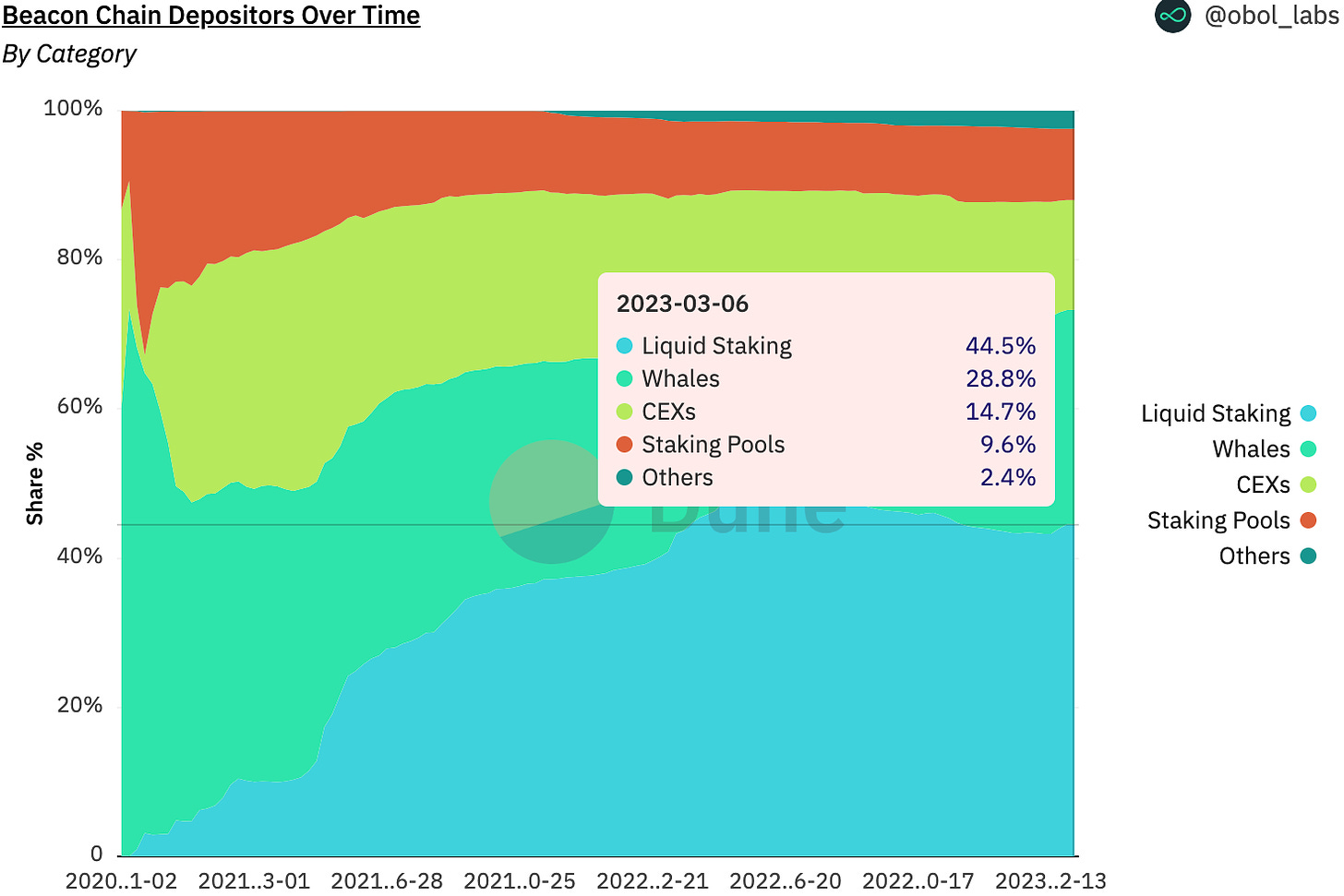 LSD HODLers are the least likely to sell: they have already had liquidity on their stake and accrued rewards have already been captured in the market prices of liquid staking tokens and have previously benefited from liquidity on their stake. Liquid staking protocols, inclusive of Coinbase, represent 44.5% of Beacon Chain depositors; slightly under half of the initial reward selling pressure has been reduced!