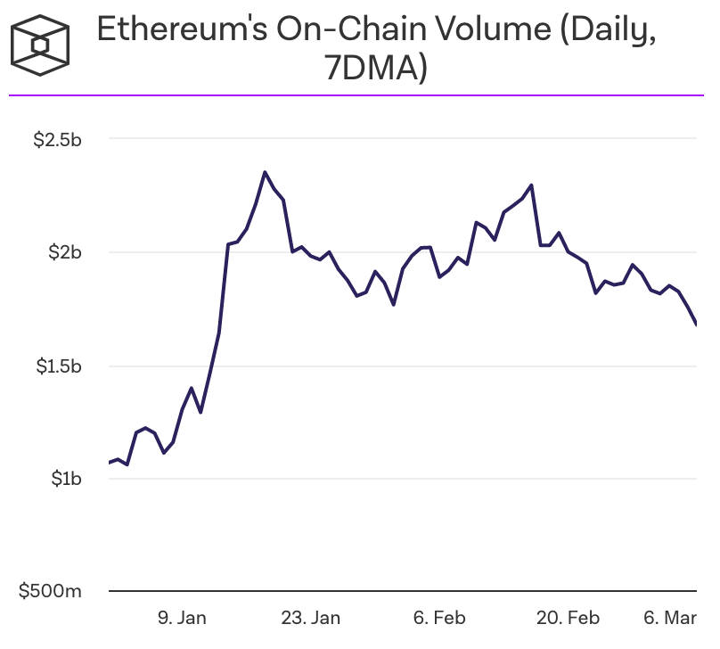 Data from The Block shows that on January 18th, seven-day moving average (7DMA) ETH exchange and on-chain trading volumes peaked at a combined $6.28B. At the time of analysis, 1M ETH is worth approximately $1.56B, representing slightly under 25% of the maximum 7DMA ETH trading volume.