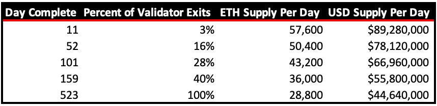 In terms of structural flows, after the initial 27-hour waiting period has passed – and assuming each validator has a balance of 32 ETH – a monstrous 57.6k of ETH is set to unlock daily for 11 days, reducing to 50.4k ETH over the next 41 days, and continuing to fall over subsequent months if continued staking outflows occur.