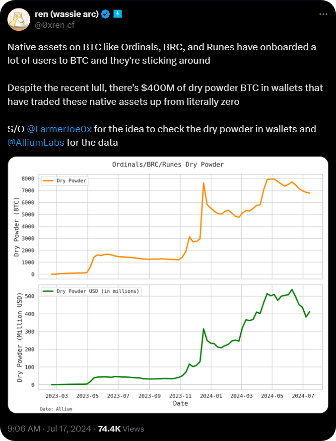 Indeed, as Electric Capital's Ren shows in the tweet below, roughly $400 million worth of unspent BTC is sitting in wallets that have traded Bitcoin-based assets like Ordinals and Runes since early last year.