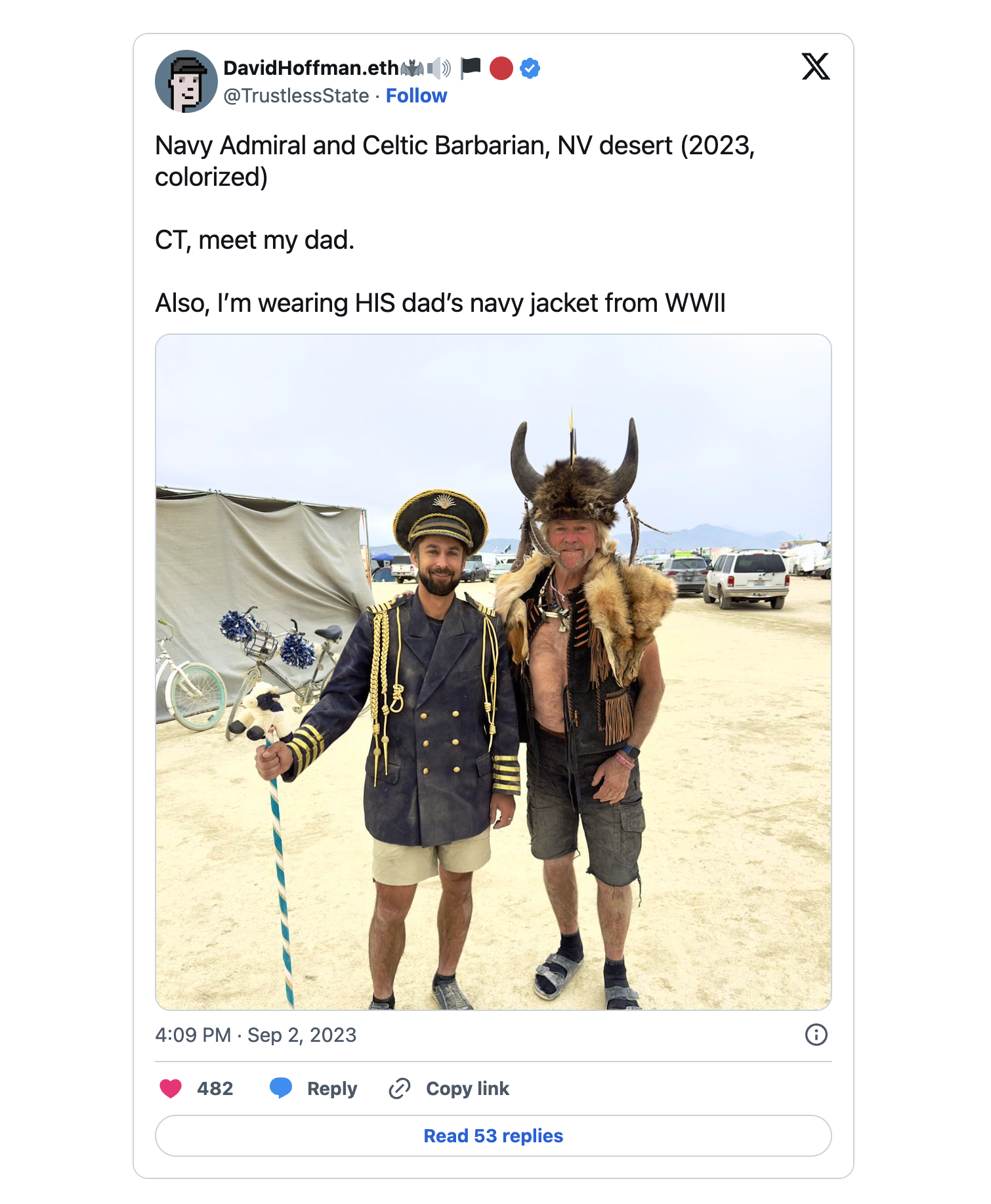 So, after a decade of even my own Burner Father saying to me, "Dave, you have to go to Burning Man," and then forming numerous relationships with crypto citizens who told me this same – this year, I decided to go see what all of the excitement was about.