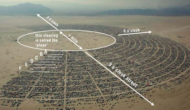 The city of Black Rock is organized in a radial shape, with The Man at the absolute center of the circle. The diameter of street A, the innermost street, is about 2 miles, leaving a massive open area of perfectly flat dusty desert for the citizens of Black Rock City to do stuff on. The streets are coordinated like a Clock, running every 30 minutes, every 15 degrees, outwards from the center. You communicate your position to fellow Black Rock citizens with "I'm at 8:30 and C". The architecture of this organization is highly conducive to the emergent properties of Burning Man, which I will discuss later.