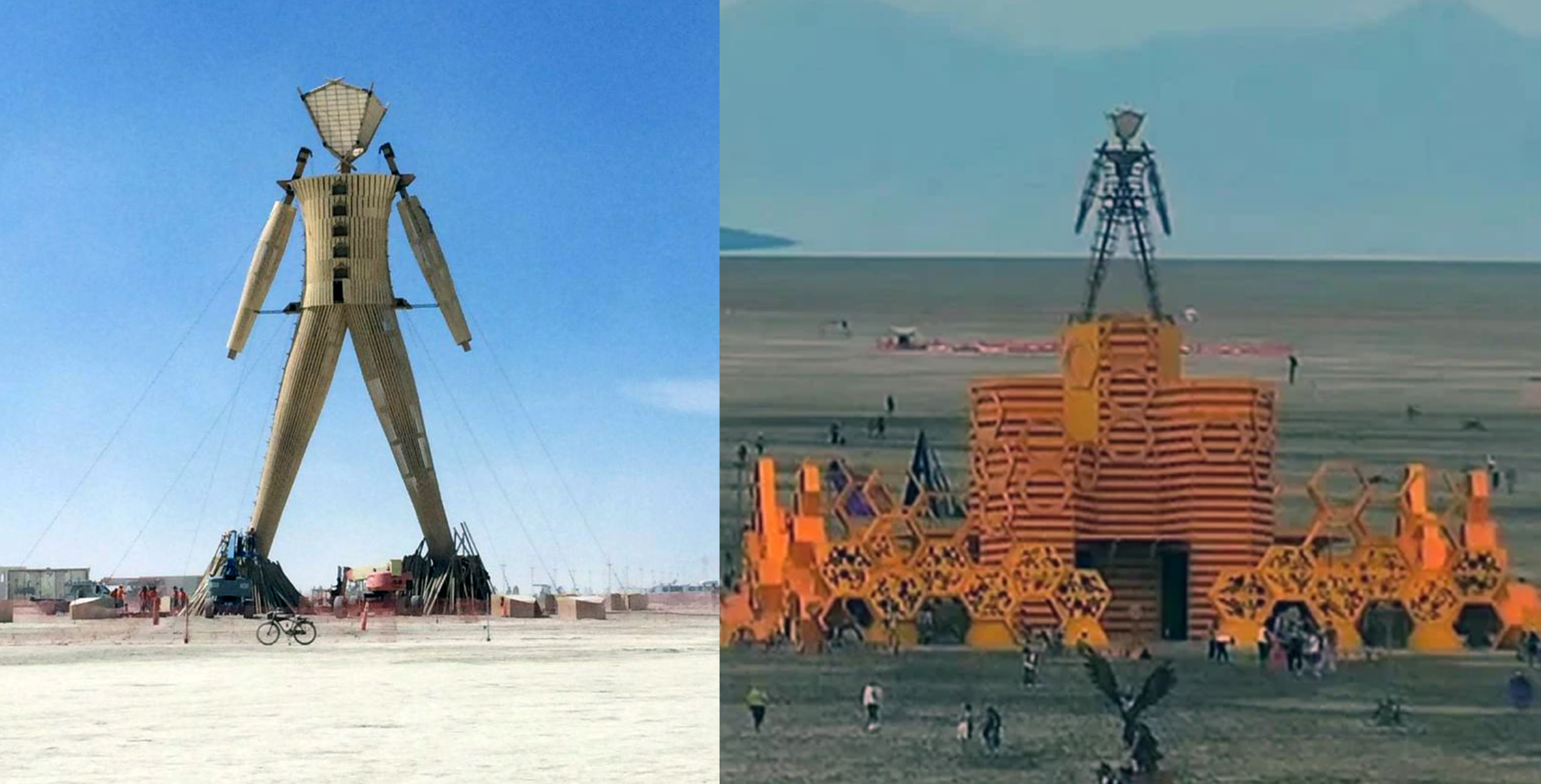 A 100-foot-tall wooden sculpture of The Man stands at the center of the clock in the middle of the playa. As you may have guessed, the end of each year's Burning Man is marked by the burning of The Man.
