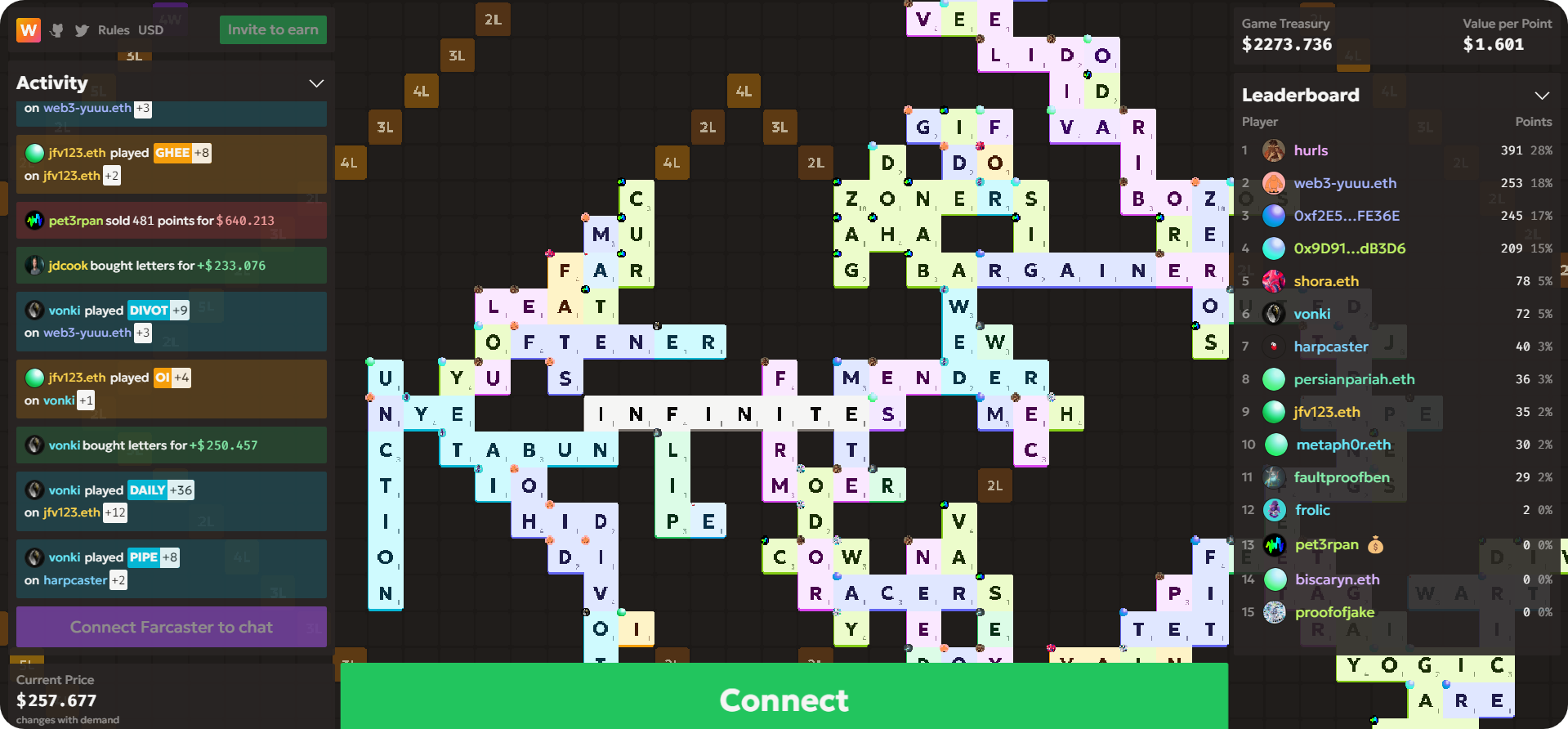 The idea? Gather letters per a dynamic price that varies with demand, contributing money to the pot. Then earn points by forming words or having others add around your words.