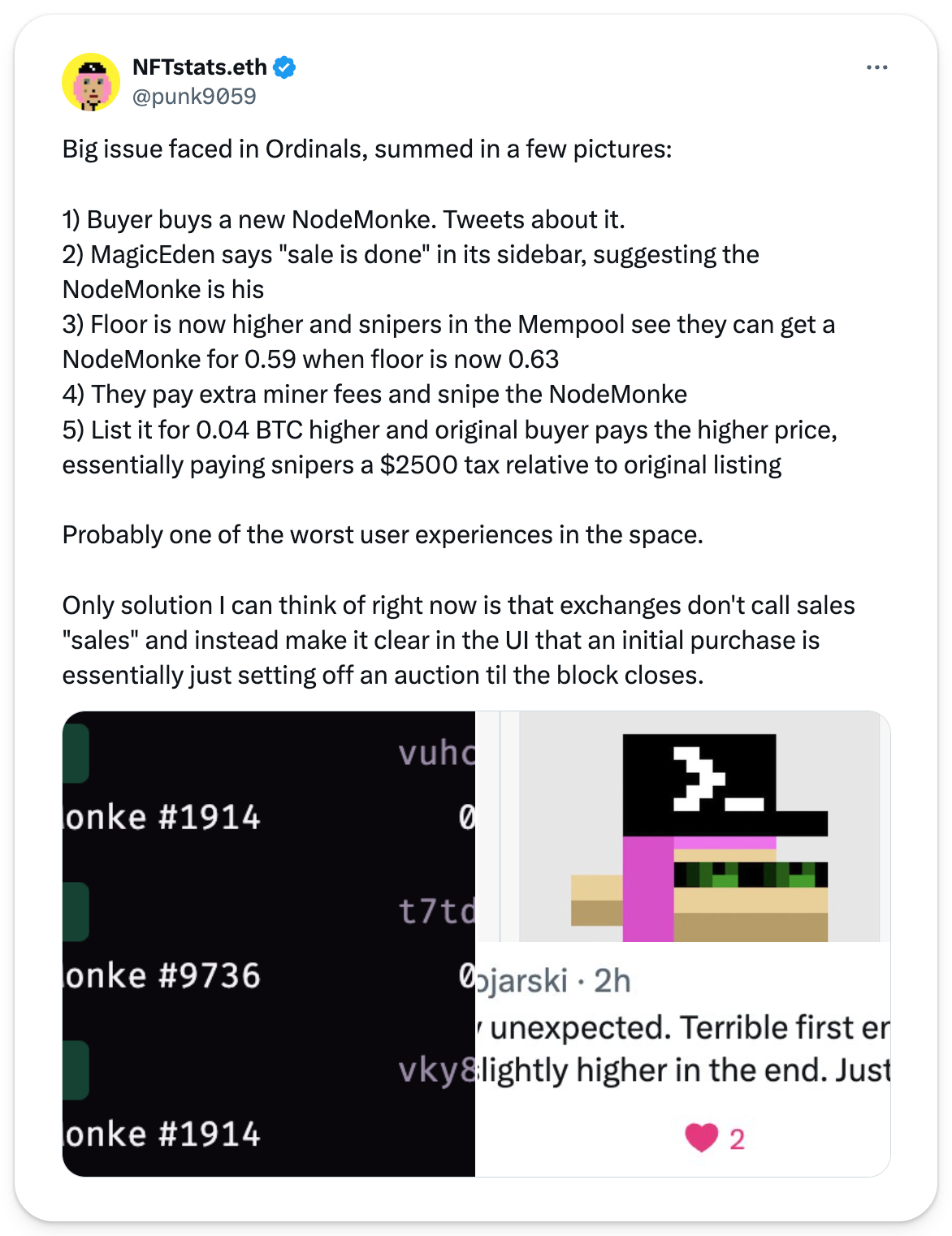 Yesterday, NFTStats.eth called Ordinals sniping "probably one of the worst user experiences in the space."
