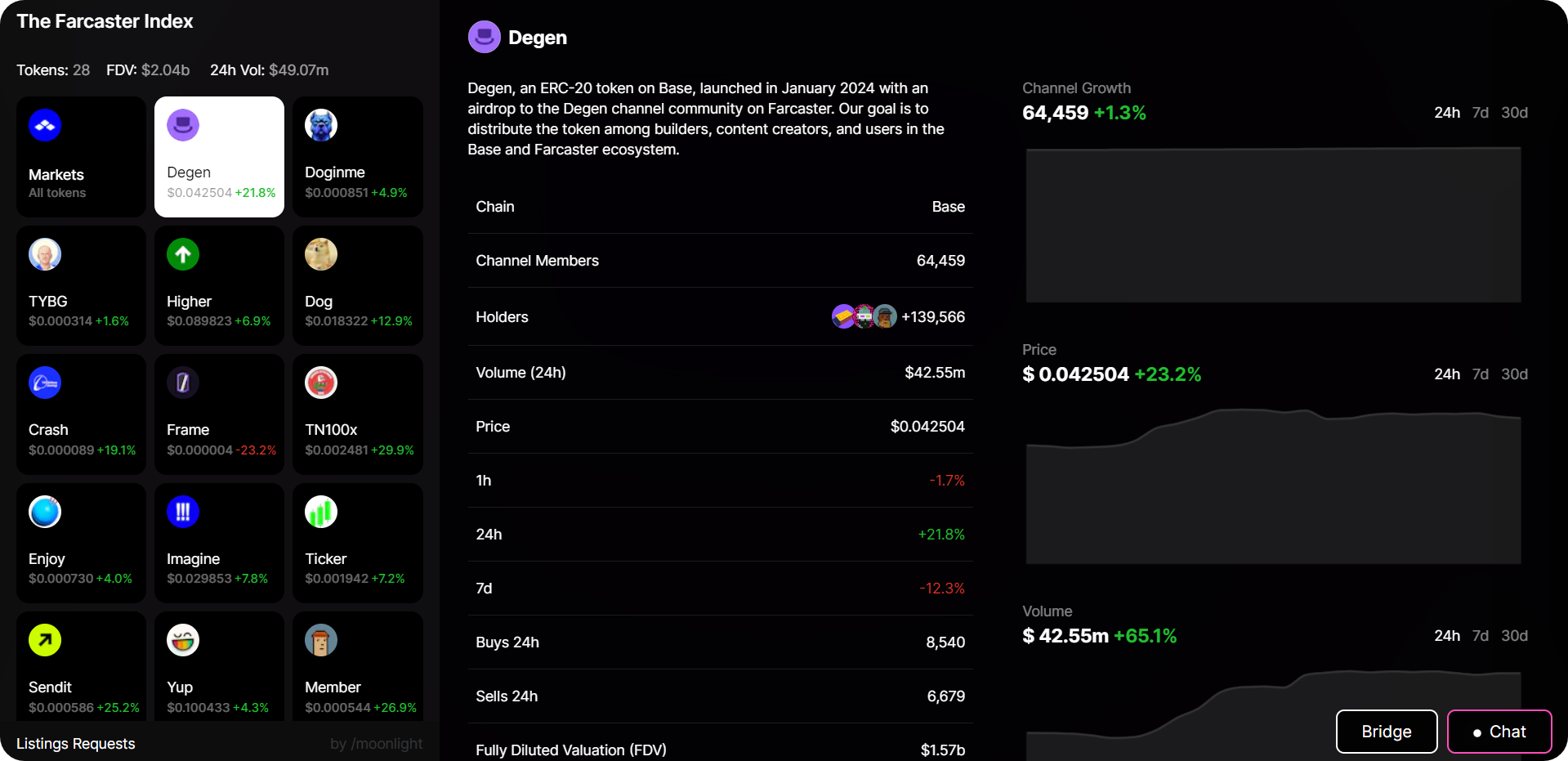 Accordingly, if you want to stay current and track all Farcaster-native tokens in one place, a great resource to check out is The Farcaster Index. From channel growth stats to volume charts, the platform offers all the basics you need to start navigating Farcaster tokens in style.