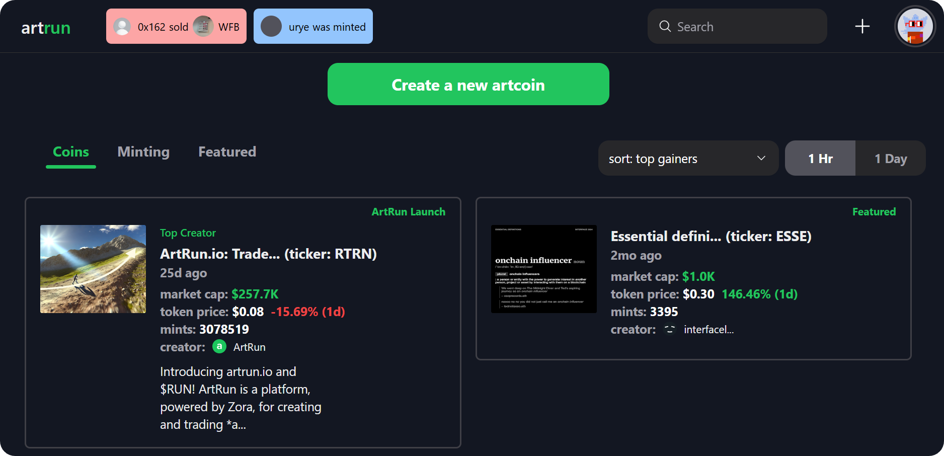 Here, cue in ArtRun. It’s an alternative Zora client that operates atop the underlying Zora protocol to create a streamlined artcoin trading hub.