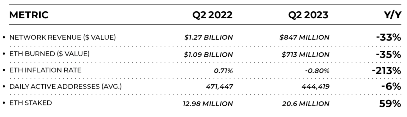 These numbers compare Ethereum’s performance in Q2 2023 against Q2 2022.