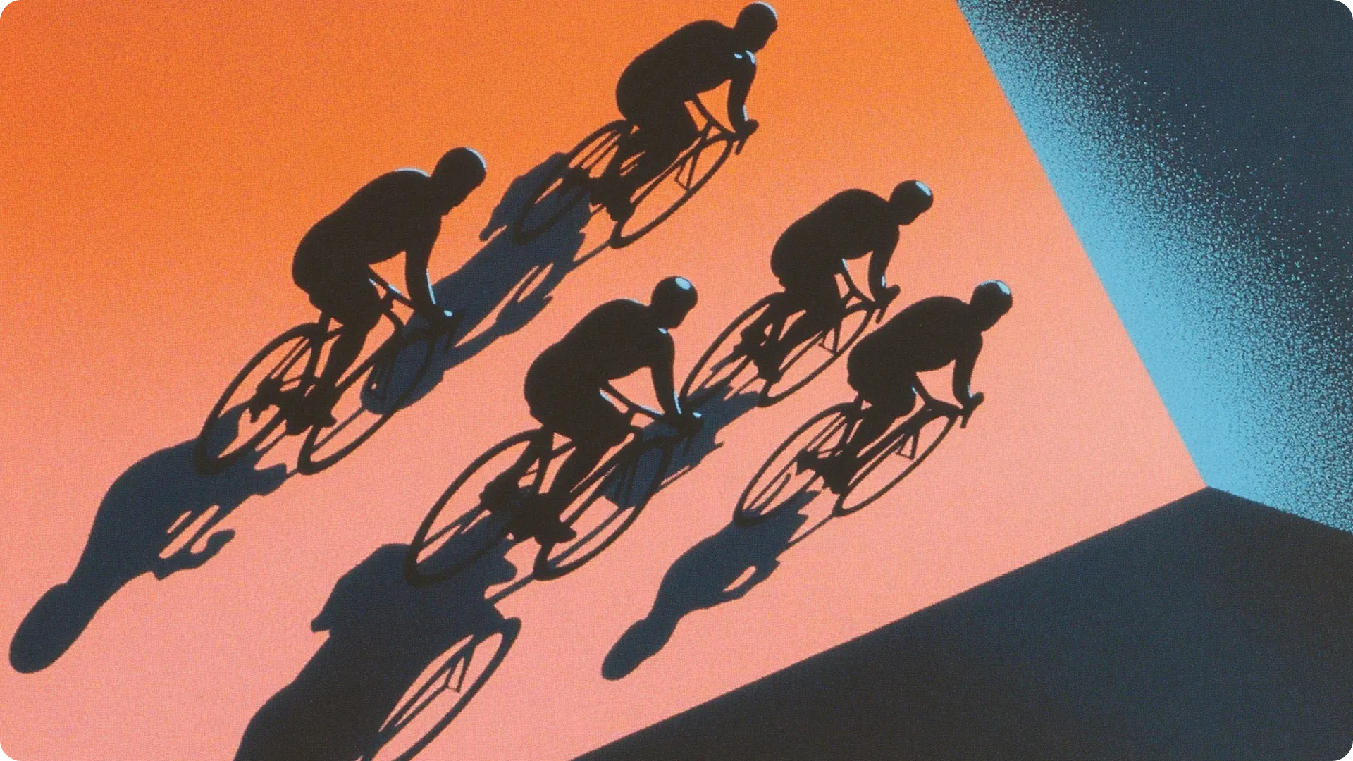 No one in a peloton rides alone. When the leader tires, they slip back into the draft and someone fresh takes the wind. In the middle of a peloton, air resistance can drop by 60% – you can just coast while the group pulls you forward.
