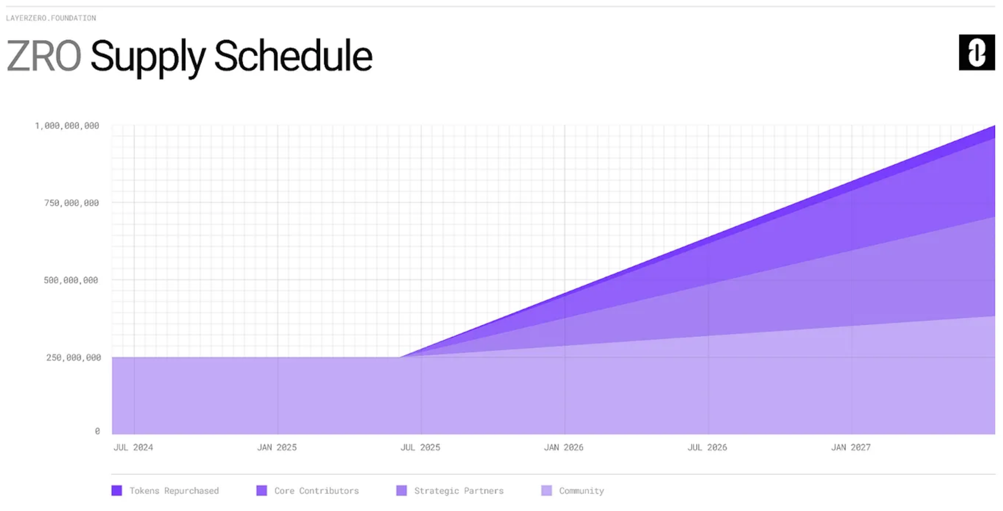 LayerZero’s investors and advisors will receive 322M ZRO under the “Strategic Partners” distribution, meanwhile, “Core Contributors” (i.e.; present and future members of the LayerZero Labs team) will receive 255M tokens. Both buckets of insider allocations are subject to a one-year lockup followed by two years of linear monthly vesting.